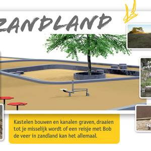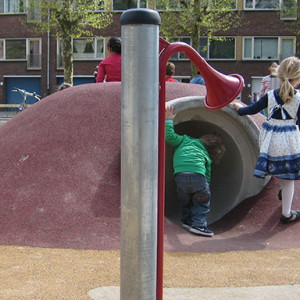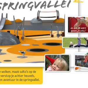 Op een verhoging aan de noordzijde van de speelplek zijn 2 glijbanen opgenomen in het landschap. Aan de zandbakzijde kunnen jonge kinderen via een brede taludglijbaan een vriendelijk speellandschap betreden met toestellen die aansluiten bij deze doelgroep. Door lichte glooiingen in het landschap en kleuraccenten op de juiste plekken in het gietrubber, krijgen deze toestellen extra speelwaarde. In combinatie met de stapbollen, klimtouwen en de taludglijbaan, ontstaat een gesloten speelparcours voor de jongste kinderen binnen de speeltuin aan de zandbakzijde.