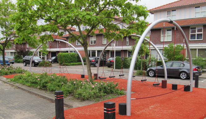 De bewoners van de Vierlinghweg in Lansingerland wilden graag een speelplekje in hun straat. Langs een deel van het plantsoen is een evenwichtsparcours gerealiseerd met klim- en balanceerelementen.