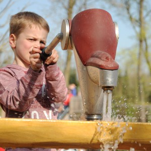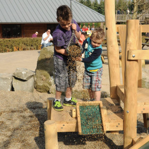 Samenwerken en samen spelen, dat is het uitgangspunt geweest voor de inrichting van de waterspeelplek in GaiaZOO. Met de waterpomp kunnen kinderen zelf bepalen hoeveel water de speeltuin instroomt. Door middel van goten en een waterschroef kunnen kinderen vervolgens het water verplaatsen. Alle goten zijn anders, sommige goten hebben sluizen, andere hebben scharnieren of stoppen die kinderen zelf kunnen bedienen. Moddertafels, zandtakels en zandgravers maken de waterspeelplek compleet.